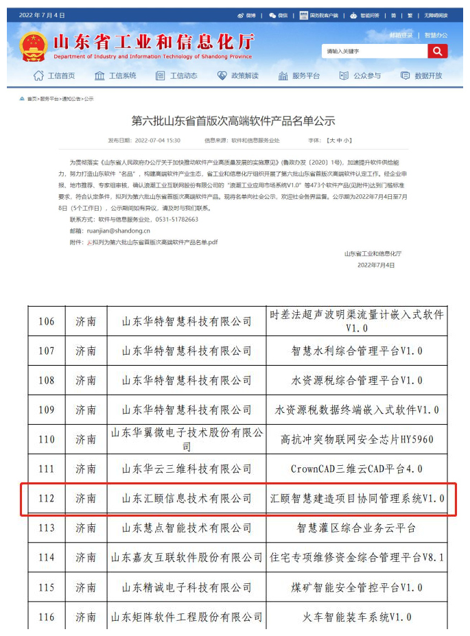 7月4日,山东省工业和信息化厅公示了第六批山东省首版次高端软件产品名单,经过层层筛选审核,金年会技术汇颐科技自主研发的“汇颐智慧建造项目协同管理系统V1.0”符合认定条件,成功入选。